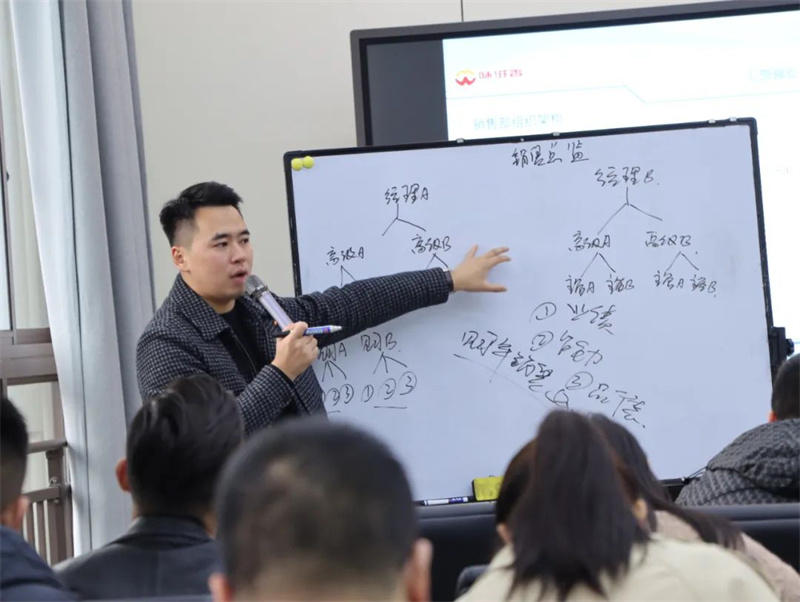 多多28董事长兼总经理王刚就本次外出学习进行分享心得体会;对企业发展作以规划;带领全体参会成员学习了企业文化;就2023年年度精英及5-10月销售精英奖励表彰。对乐于助人,积极向上、进步较大的三名员工颁布了杰出进步奖。